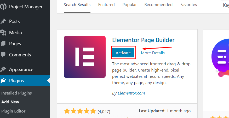 Elementor free의 설치 과정은 다른 플러그인과 동일합니다: