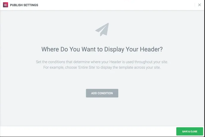 - 이를 적용하려면 바닥글 왼쪽에 있는 PUBLISH 버튼을 클릭합니다. 새 헤더를 표시할 위치를 묻는 팝업이 표시됩니다.