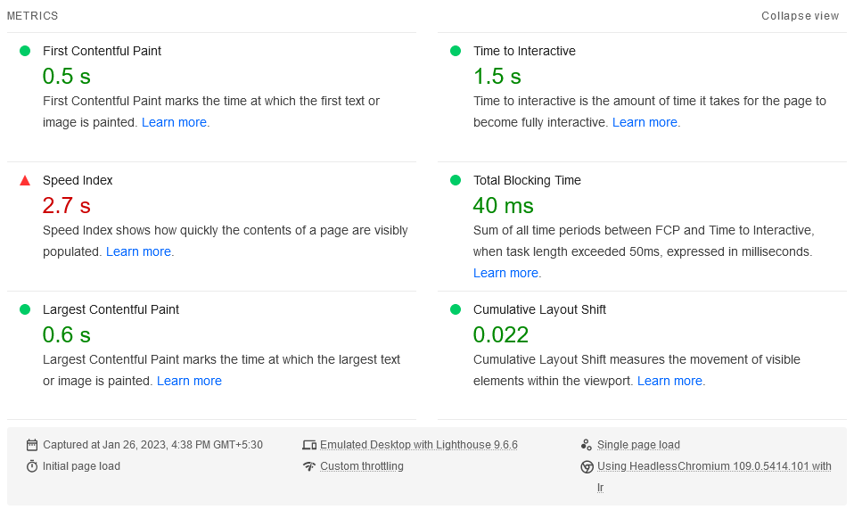 웹사이트의 URL이 도구에 입력되면 Google PageSpeed Insights가 웹사이트를 로드하고 성능에 대한 데이터를 수집합니다. 다음 메트릭을 측정합니다.