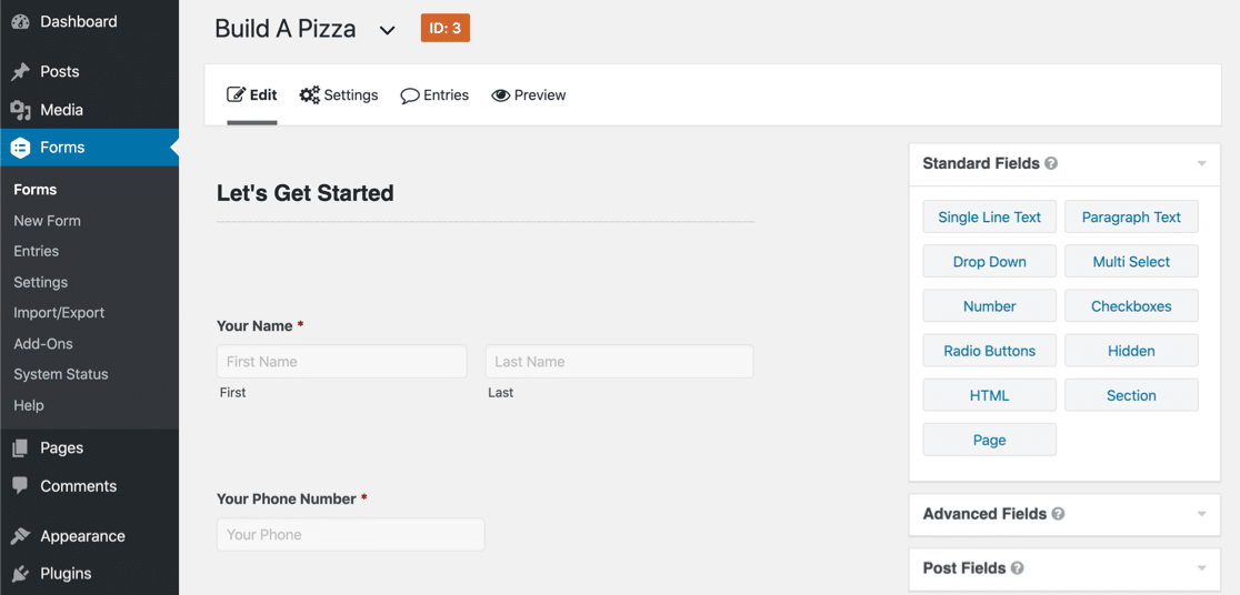 Gravity Forms 빌더는 WordPress 인터페이스 내에서 열립니다. 즉, Gravity Forms 대 Ninja Forms 또는 WPForms에서 작업할 공간이 적습니다.
