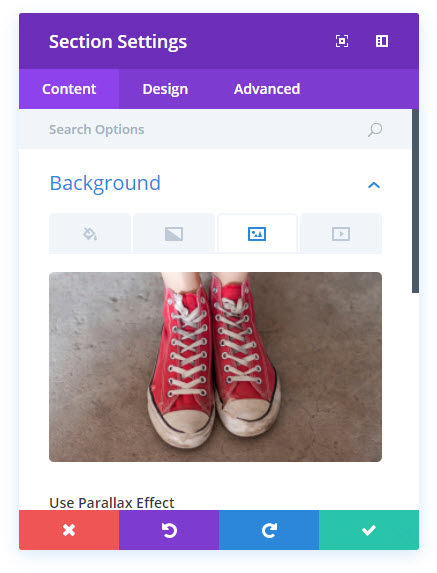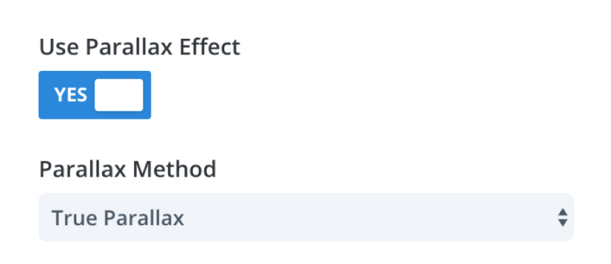 그 자리에 있으면 위에서 했던 것과 같은 방식으로 배경을 추가해 보겠습니다. 이번에는 섹션 설정에서 "시차 옵션 사용"을 선택하려고 합니다. "CSS" 대신 "True Parallax" 드롭다운을 유지합니다.