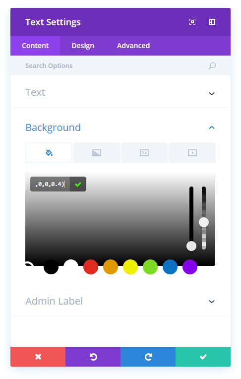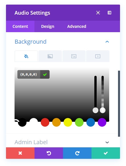 다음으로 녹색을 띤 청록색을 완전히 투명한 배경으로 변경해 보겠습니다. 색상은 중요하지 않습니다. 투명도 막대를 맨 아래로, 또는 RGBA의 마지막 숫자가 0이 될 때까지 밉니다.