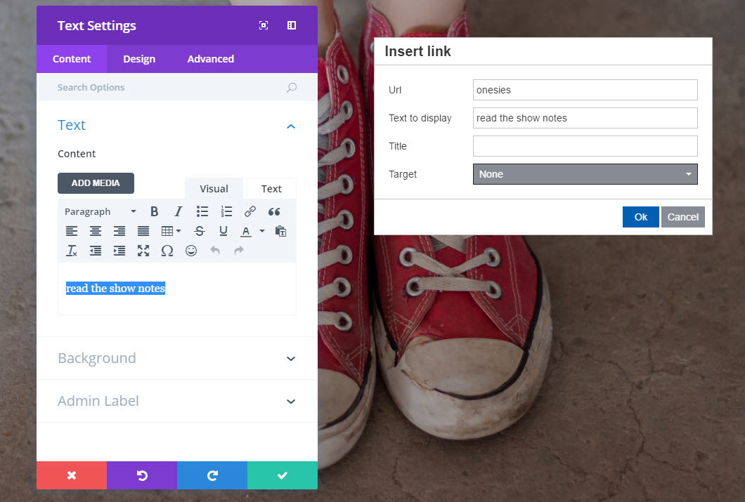 세 번째 열에 새 텍스트 블록을 만들고 설정을 열고 원하는 링크 텍스트를 입력합니다. 이 예에서는 "쇼 노트 읽기"가 자명합니다.