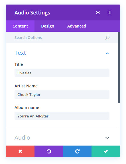 오디오 모듈의 설정을 엽니다. 오디오 필드는 자신의 파일을 사용하는 호스트에 업로드하거나 사용하는 팟캐스팅 서비스의 미디어 파일에 직접 연결할 수 있는 곳입니다. 저는 Libsyn을 사용하므로 미디어 URL을 가져와서 붙여넣었습니다.