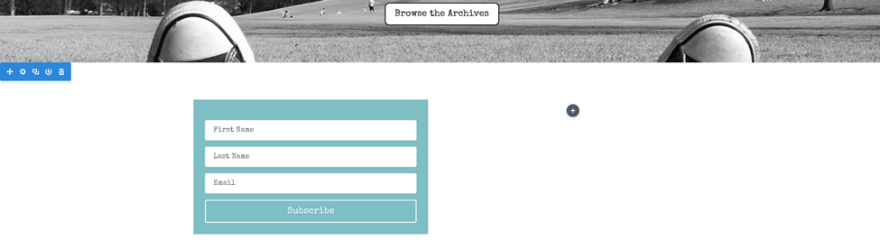 이 섹션에 남은 유일한 것은 "아카이브 찾아보기" 버튼을 추가하는 것입니다. 녹색 +를 클릭하여 맨 아래에 새 행을 만들고 단일 열 레이아웃을 사용합니다. "버튼" 모듈을 삽입합니다. 이렇게 하면 매우 읽기 어려운 버튼(물론 배경에 따라 다름)이 만들어지며 여기에는 몇 가지 간단한 스타일이 필요합니다.