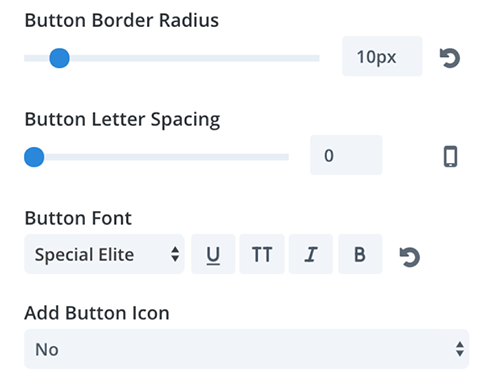 그런 다음 테두리 반경을 10px로 설정하고 글꼴을 "Special Elite"로 설정하고 단추 추가 아이콘을 "기본값"에서 "아니요"로 변경하여 단추 모서리를 둥글게 만들고 싶습니다.