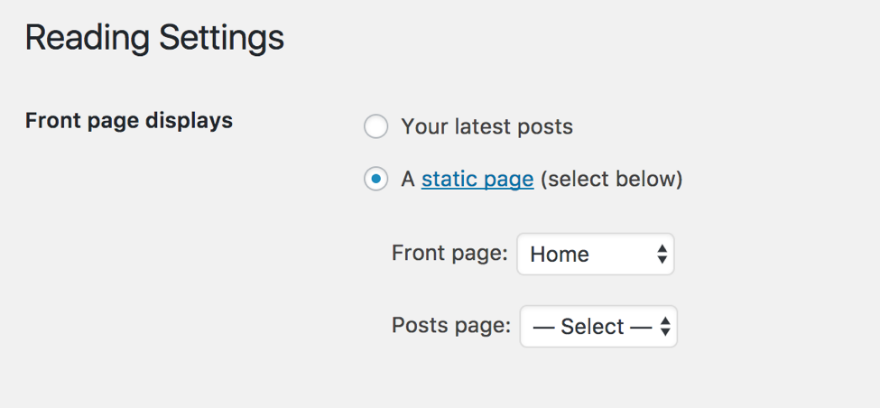 WordPress 대시보드에서 새 페이지를 만들고 사이트의 첫 페이지로 설정하여 시작합니다. (편리하게 "집"이라고 이름을 지었습니다.)