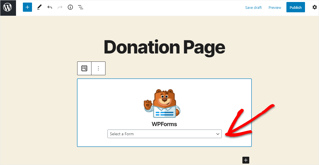 WPForms 위젯이 블록 안에 나타납니다. 이제 WPForms 드롭다운을 클릭하고 이미 생성한 양식 중 기부 페이지에 삽입할 양식을 선택하십시오.