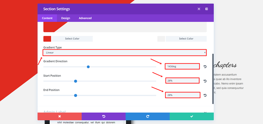 우리가 설명할 다음 단계는 그라디언트 배경입니다. 우리는 정말 단순한 것을 선택했지만 이는 섹션에 훌륭한 부가 가치를 제공합니다. 배경 그라디언트를 다시 만들려면 섹션의 설정으로 이동하십시오. 그런 다음 배경 하위 범주에서 그라디언트 배경에 대해 다음 두 가지 색상을 사용합니다.