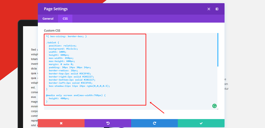 그런 다음 CSS 탭으로 이동하여 다음 CSS 코드 행을 Custom CSS 필드에 붙여넣습니다.