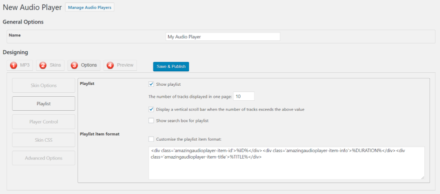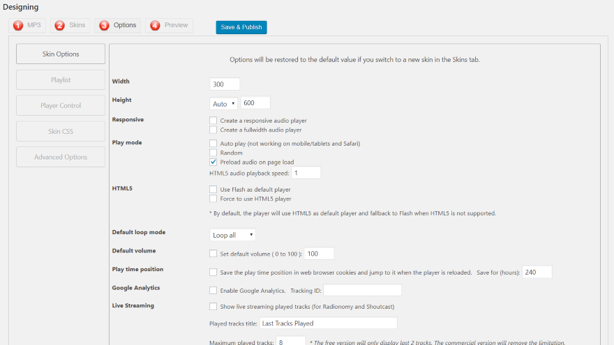 옵션 을 선택 합니다. 여기에서 조정할 수 있는 기능이 있는 여러 탭을 볼 수 있습니다. 스킨 옵션 탭에서는 크기 변경, 반응형 만들기, 재생 모드 선택, Flash 또는 HTML5 사용, Google Analytics 사용, 라이브 스트리밍 옵션 설정 등을 할 수 있습니다.