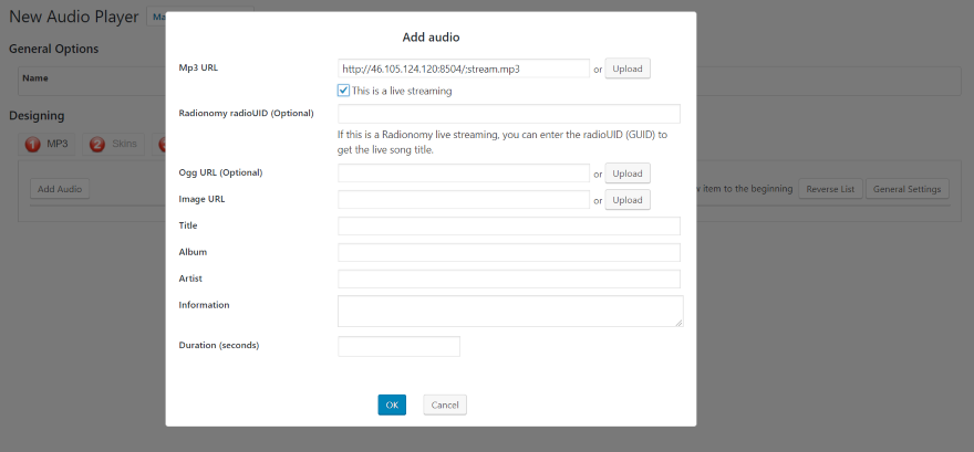 MP3 탭에서 오디오 추가 를 선택합니다. 스트림의 URL을 MP3 URL 필드에 붙여넣고 이것은 라이브 스트림 입니다. 확인 을 클릭 합니다. 플레이어는 청취자가 선택할 수 있는 여러 스트림을 가질 수 있습니다. 오디오 추가를 다시 선택하여 동일한 플레이어에 다른 스트림을 추가합니다.