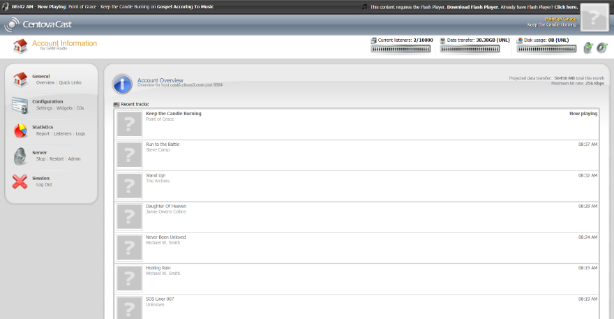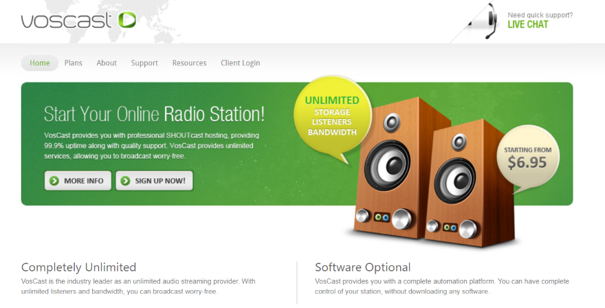 VosCast는 자동화된 플랫폼으로 SHOUTcast 호스팅을 제공합니다. 무제한 저장 공간, 대역폭 및 수신기와 Flash 플레이어가 있습니다. 품질 범위는 28-192k입니다. 가격은 월 $6.95-48.95입니다.