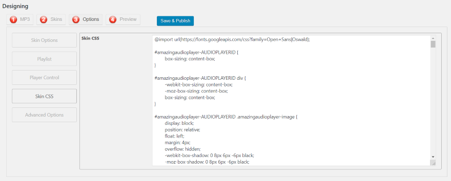 스킨 CSS 와 고급 옵션 모두 CSS에 대한 필드를 제공합니다. 여기에 사용자 정의를 추가하십시오.