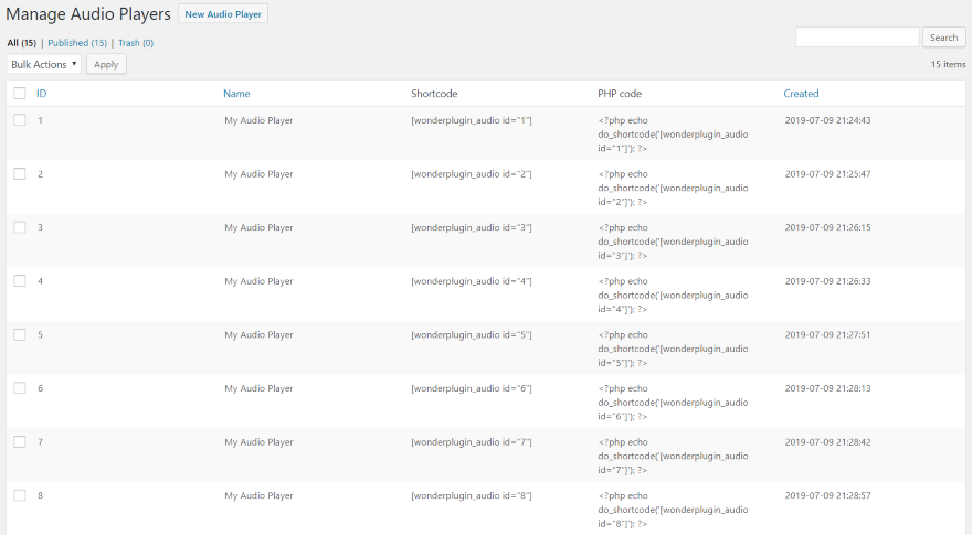 플레이어를 게시하면 목록에 표시됩니다. 여기에 플레이어를 표시할 위치에 복사하여 붙여넣을 수 있는 단축 코드가 표시됩니다.