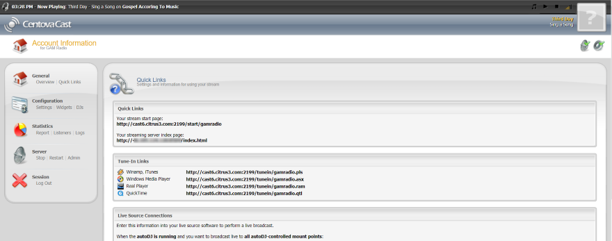 스트리밍 서비스를 설정했으면 라이브러리를 업로드하거나 컴퓨터의 라이브러리에 연결합니다(이는 지나치게 단순화되었으며 선택한 서비스에 따라 다름). GAMRadio의 Citris3용 대시보드입니다.