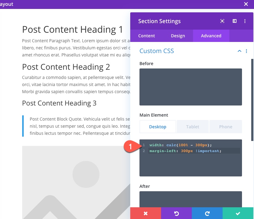 그런 다음 고급 탭으로 이동하여 다음 사용자 정의 CSS를 기본 요소에 붙여넣습니다.