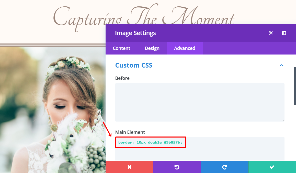 행의 첫 번째 열에 이미지 모듈을 추가합니다. 이미지 하위 카테고리의 콘텐츠 탭에서 신부 이미지를 업로드하고 고급 탭으로 이동합니다. Custom CSS 하위 카테고리를 클릭하고 Main Element 필드에 다음 코드 라인을 추가합니다.