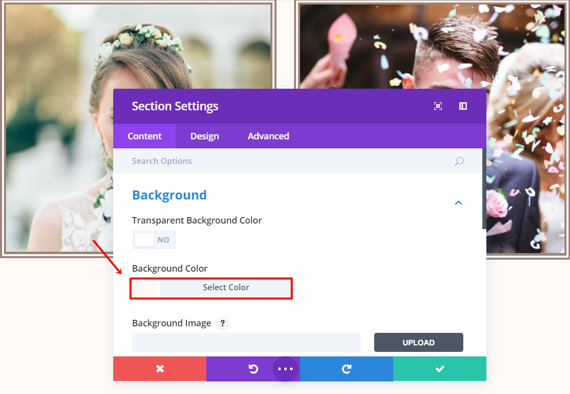 방금 만든 섹션의 설정을 열고 콘텐츠 탭에서 배경 하위 범주를 엽니다. 그런 다음 배경색을 '#fffaf6'으로 변경합니다.
