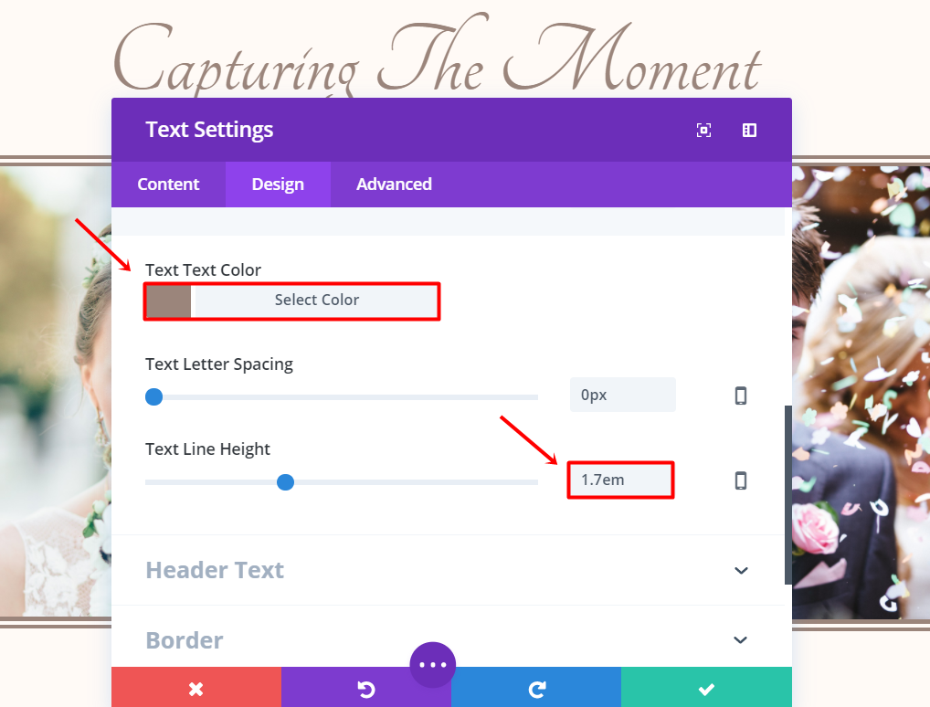 다음으로 행에 텍스트 모듈을 추가합니다. 설정을 열고 텍스트 하위 범주의 텍스트 상자에 표시할 제목을 입력합니다. 계속해서 디자인 탭으로 이동하여 텍스트 하위 범주에서 다음과 같이 변경합니다.