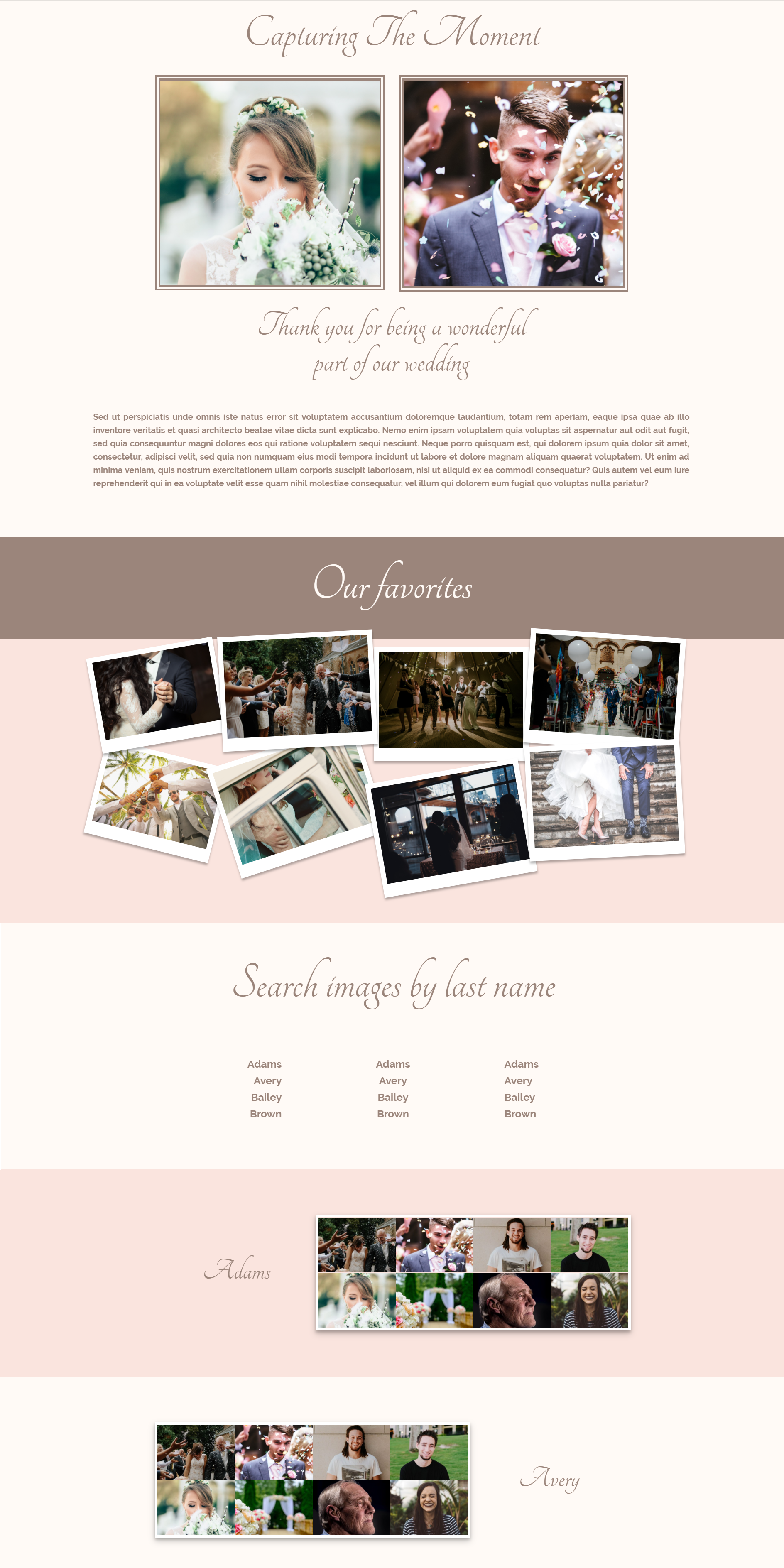 일반적으로 결혼식에서 찍은 사진이 많아서 특정 구조를 찾기가 어려울 수 있습니다. 그래서 우리는 이 갤러리 페이지의 갤러리 섹션을 조금 더 쉽게 만들기로 결정했습니다. 갤러리는 손님의 성을 기준으로 표시되므로 손님이 자신의 사진을 쉽게 찾을 수 있습니다.