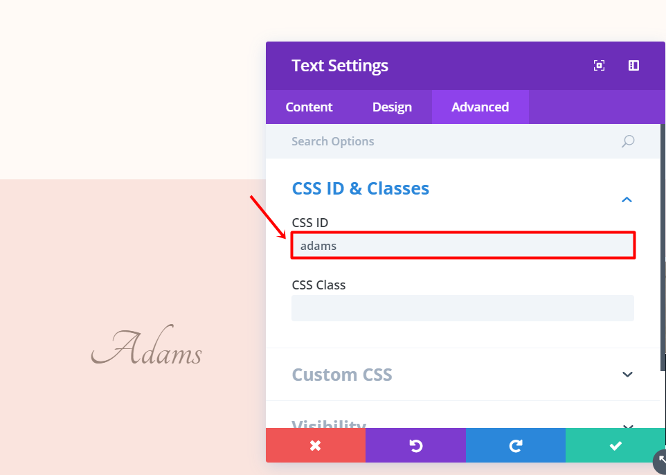 고급 탭으로 이동합니다. CSS ID 및 클래스 하위 범주의 CSS ID 필드에서 위에서 만든 앵커 링크를 텍스트 모듈에 연결해야 합니다. 따라서 목록의 첫 번째 앵커 링크가 '#adams'인 경우 'adams'를 입력해야 합니다. ID가 이전에 만든 목록의 이름에 연결한 것과 동일한지 확인합니다.