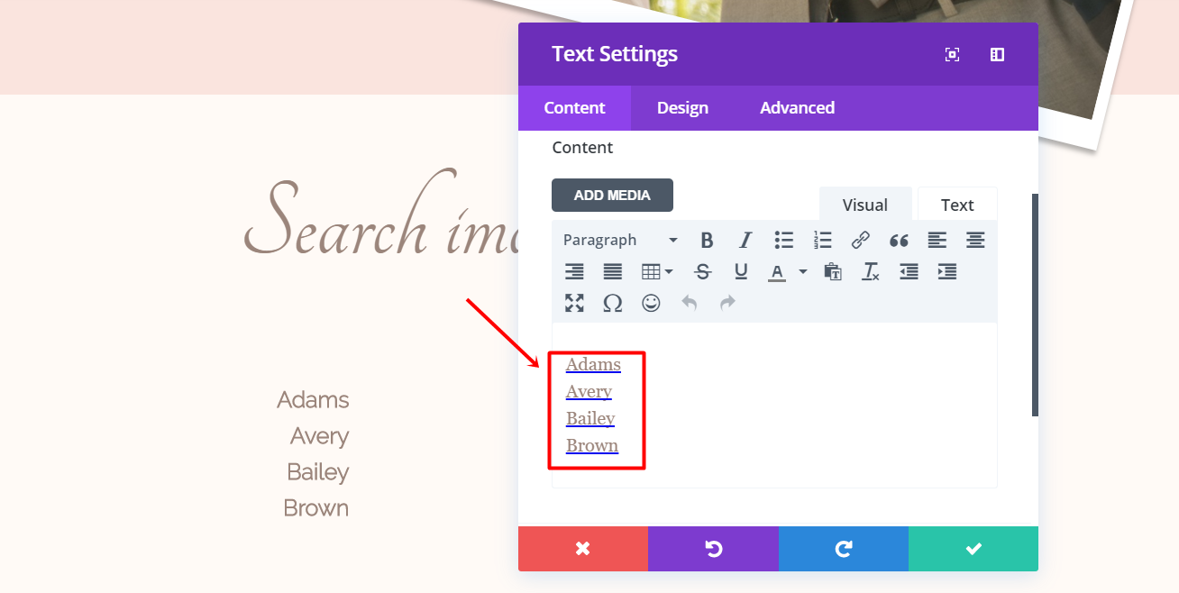 이제 텍스트 모듈을 추가하고 콘텐츠 탭의 텍스트 하위 범주에 있는 텍스트 상자에 패밀리의 성을 입력합니다. 계속해서 디자인 탭으로 이동하여 다음과 같이 변경합니다.
