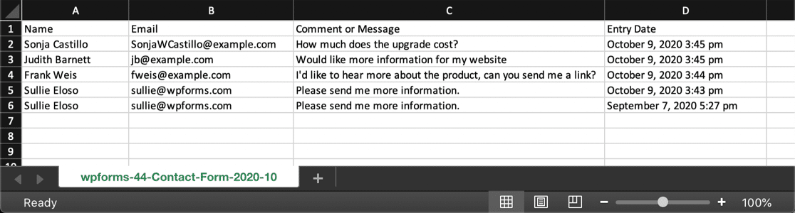 그리고 그게 다야! 이제 WordPress에서 양식 항목을 내보내고 Excel 또는 다른 스프레드시트 프로그램에서 CSV를 보는 방법을 알게 되었습니다.