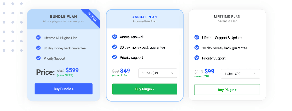 단일 플러그인 라이선스 대신 iThemeLand 모든 플러그인 번들을 고려하는 경우에도 마찬가지입니다. 그것으로 당신은 각각을 개별적으로 구입하는 것보다 훨씬 저렴한 비용으로 많은 플러그인을 얻을 수 있습니다.