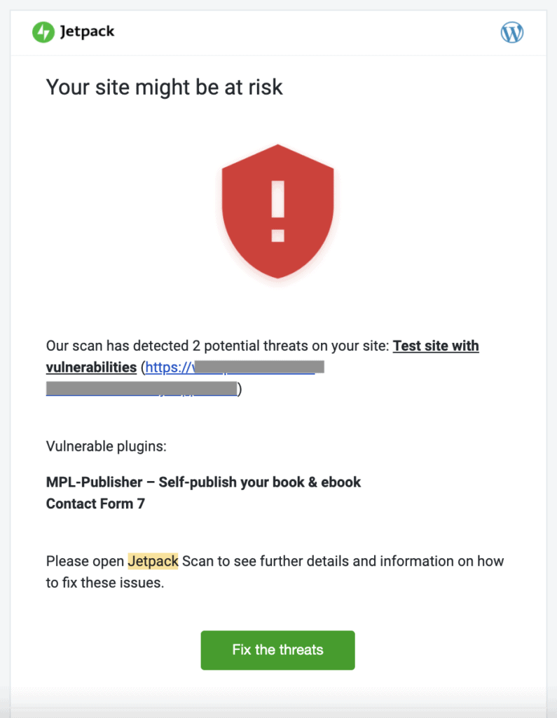 웹 사이트에 문제가 발생하면 즉시 파악하여 문제를 해결할 수 있기를 원합니다. Jetpack은 스캔이 완료된 후 즉시 맬웨어 및 잠재적 취약성을 경고합니다. 맬웨어에 대한 대시보드 알림도 있습니다. 이러한 경고는 미션 크리티컬하기 때문에 좋습니다. 상황이 나쁠 때 즉시 알고 싶습니다.
