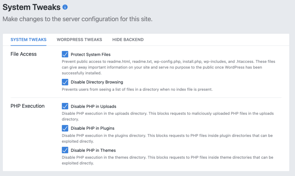 우리가 합리적이라고 생각한 한 가지 기능은 업로드 폴더에서 PHP 실행을 차단하는 것입니다. 그러나 iThemes는 또한 플러그인 및 테마 폴더에 대해 그렇게 할 것을 제안하며 이는 완전히 광기입니다. 일부 플러그인에는 직접 액세스해야 하는 스크립트가 있으며 이 경우 반드시 중단됩니다. 일반 사용자가 이것이 사실인지 판단하는 것은 불가능합니다.