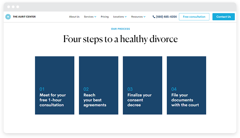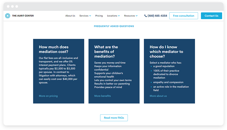 Aurit Mediation의 랜딩 페이지는 무료 1시간 상담 제안을 강조하여 방문자를 고객으로 전환하도록 완벽하게 설계되었습니다. 초기 무료상담의 가치를 강조하면서 이혼조정의 장점을 효과적으로 전달합니다.