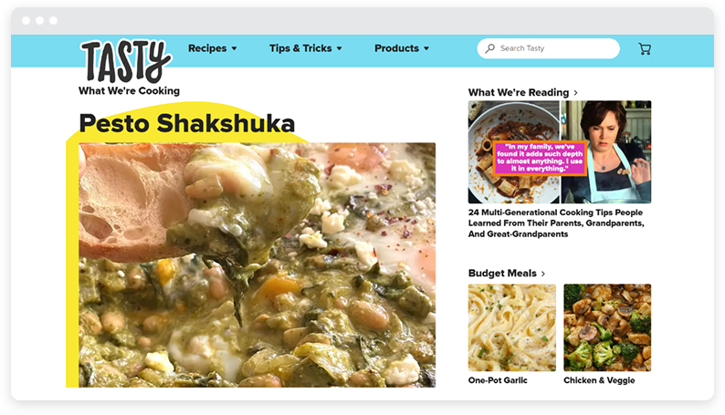 깨끗하고 여유로운 접근 방식을 선택한 목록의 다른 브랜드와 달리 Tasty는 정반대입니다. 대신, 사이트 방문자의 관심을 끌 수 있는 재미있고 편안한 분위기를 조성하기 위해 다양한 색상을 사용합니다.