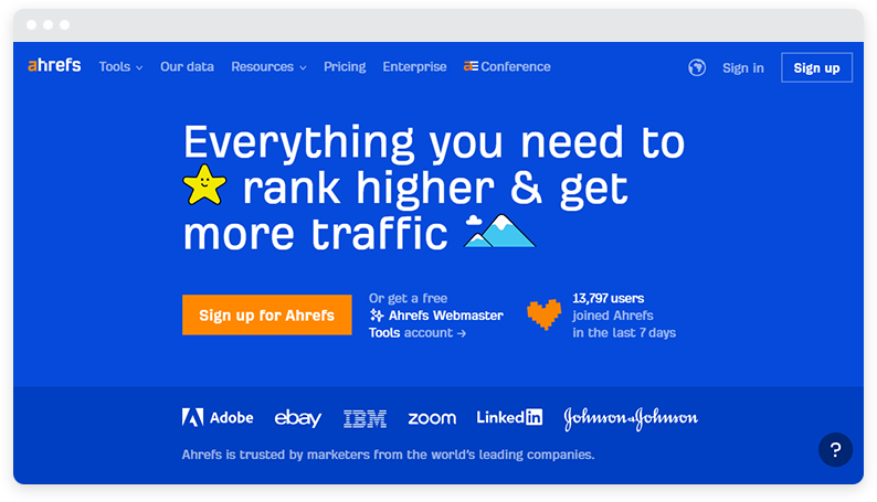 Ahrefs의 홈 페이지는 복잡하지 않고 요점이 명확하며 인상적인 사회적 증거(예: 사용자 수 및 클라이언트 이름)를 제공합니다. 이 모든 것이 훌륭한 랜딩 페이지 콘텐츠를 만듭니다.