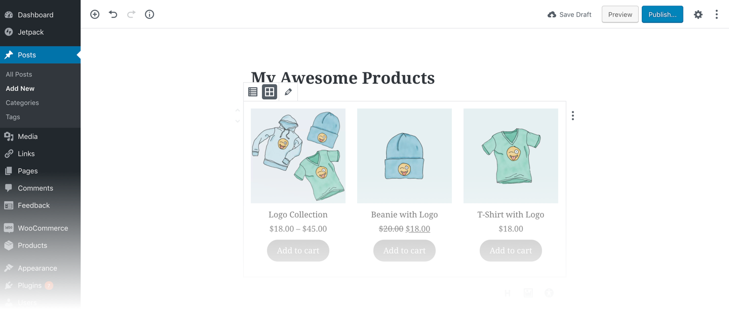 제품 블록은 다양한 소스의 제품을 삽입하기 위한 직관적인 사용자 인터페이스를 제공한 다음 게시될 때 선택 항목이 어떻게 표시되는지에 대한 정확한 미리보기를 제공합니다. 레이아웃과 순서를 조정하여 해당 제품의 모양을 미세 조정할 수도 있습니다.
