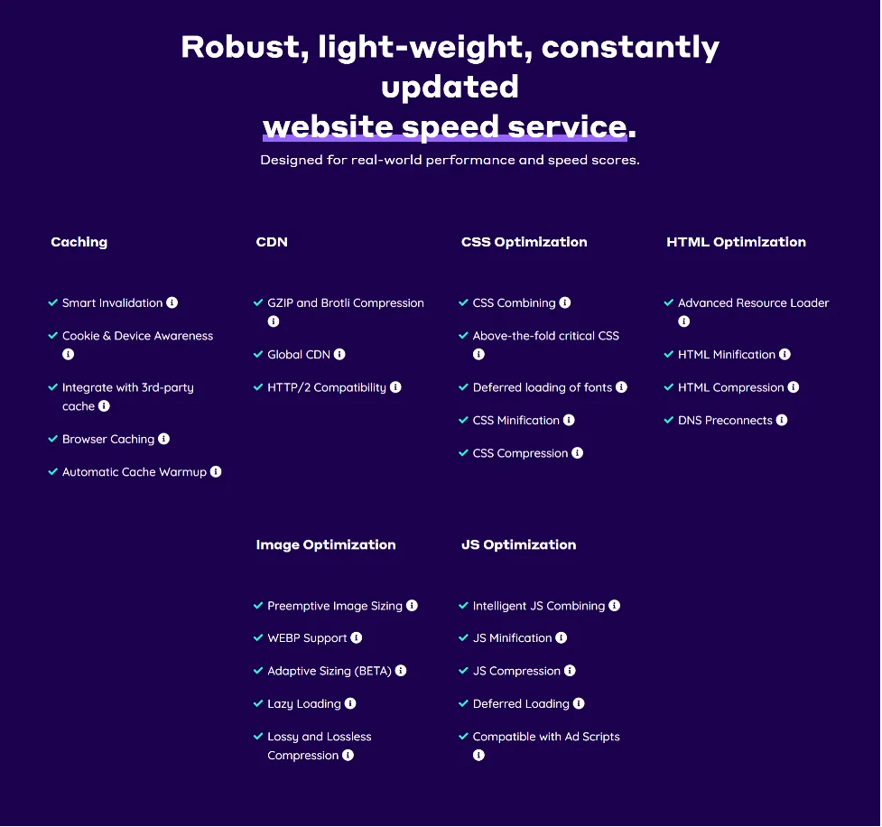 NitroPack에는 웹사이트 속도를 높이는 데 도움이 되는 기능이 포함되어 있습니다. 다음은 몇 가지 눈에 띄는 것들입니다.