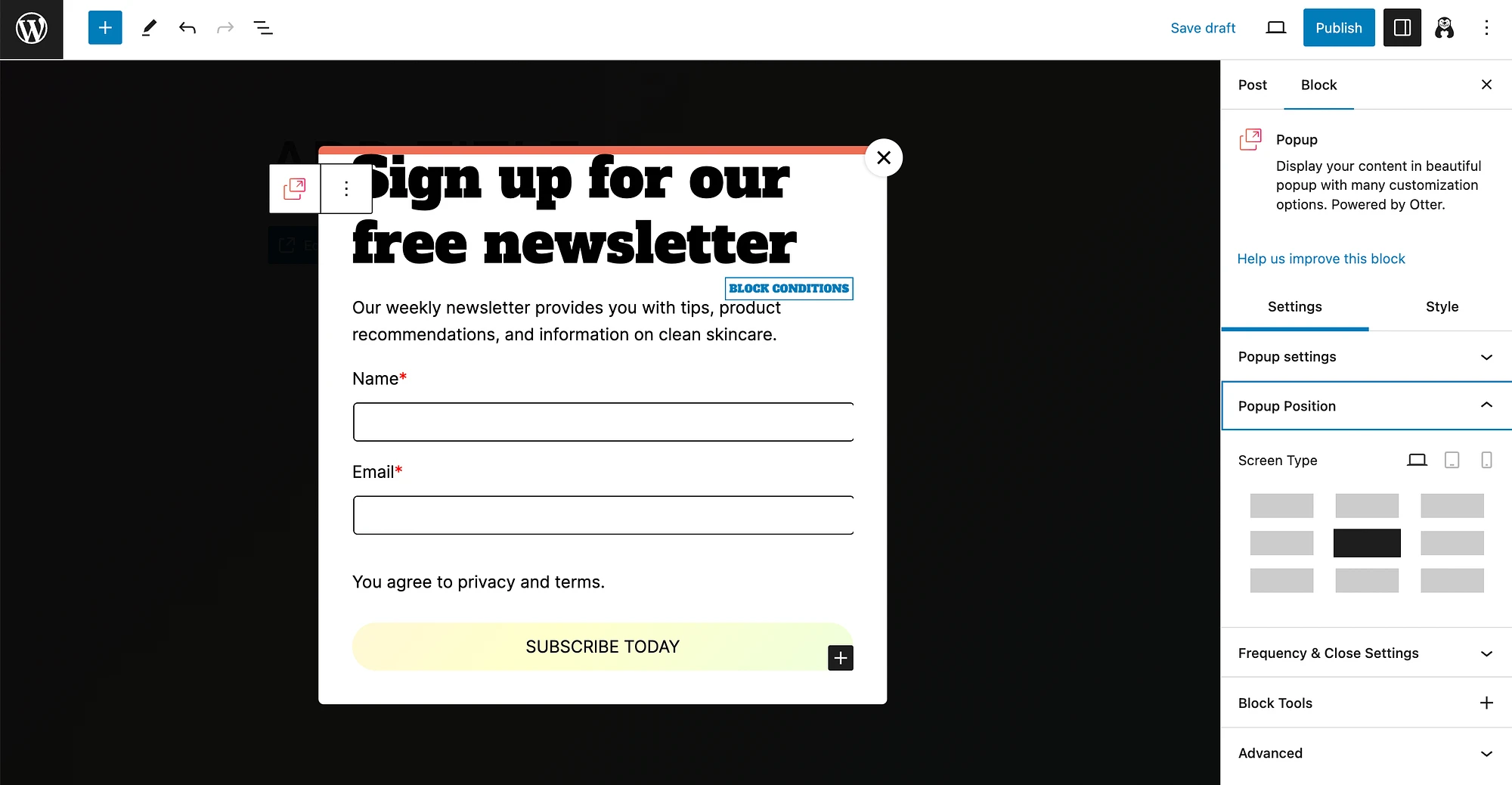 좋은 소식은 Otter Blocks와 같은 초보자 친화적인 무료 도구를 사용하여 눈길을 끄는 팝업을 만들 수 있다는 것입니다. 그런 다음 레이아웃, 글꼴, 색상 등을 포함하여 모양을 맞춤설정할 수 있습니다. 마지막으로 배치, 타이밍 등에 대한 팝업 설정을 신중하게 사용자 정의해야 합니다. ️️️