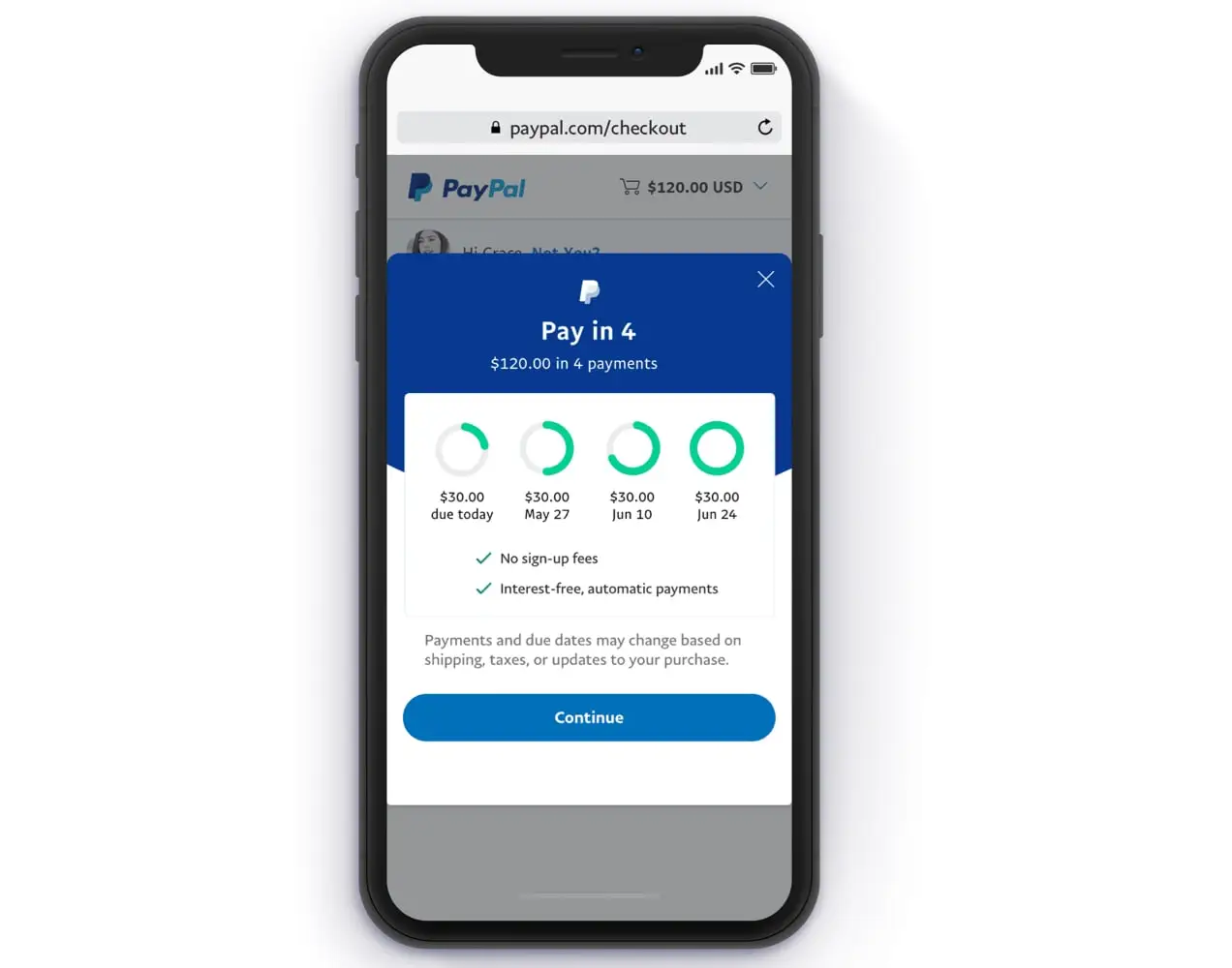 - 나중에 지불 정보(미국에서는 4시에 지불): 지불을 놓친 경우 소비자 연체료가 적용될 수 있으며 소비자의 거주 상태에 따라 다릅니다. 캘리포니아 거주자에 대한 대출은 캘리포니아 금융 대출법 라이선스에 따라 이루어지거나 준비됩니다. PayPal, Inc.는 NMLS #910457 조지아 할부 대출 기관입니다.