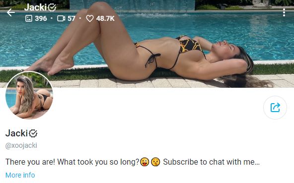Jacki의 더 많은 콘텐츠를 보고 싶다면 Jacki의 계정을 구독하고 393개의 사진과 57개의 비디오에 액세스할 수 있습니다. 운이 좋으면 그녀와 개인적으로 대화를 나눌 수도 있습니다!