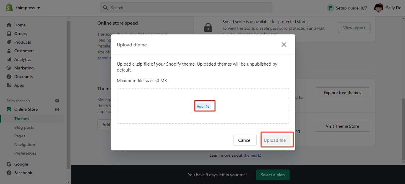 - 컴퓨터의 Zip 파일을 Shopify에 업로드합니다.