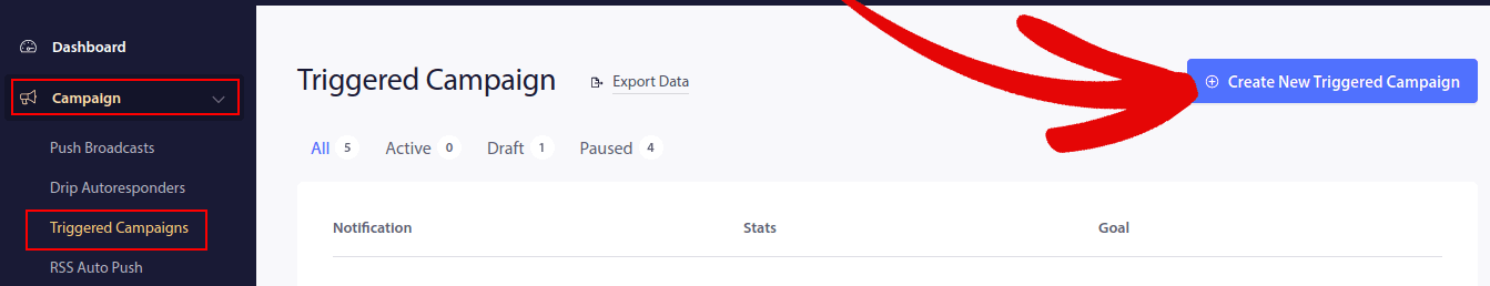 다시 PushEngage 대시보드로 이동하여 캠페인 » 트리거된 캠페인 으로 이동하여 새로운 트리거된 캠페인을 만듭니다.