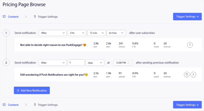 푸시 알림을 처음 사용하는 경우 푸시 알림 모범 사례에 대한 기사를 확인해야 합니다. 푸시 알림 내용이 만족스러우면 트리거 설정을 클릭하세요. 탐색 포기 캠페인의 조건이 순서에 사전 구성되어 있음을 알 수 있습니다.