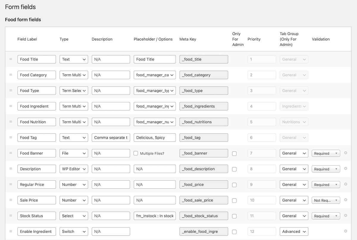 WP Food Manager 설정 내에서 이러한 음식 필드의 기본값을 변경할 수도 있습니다.