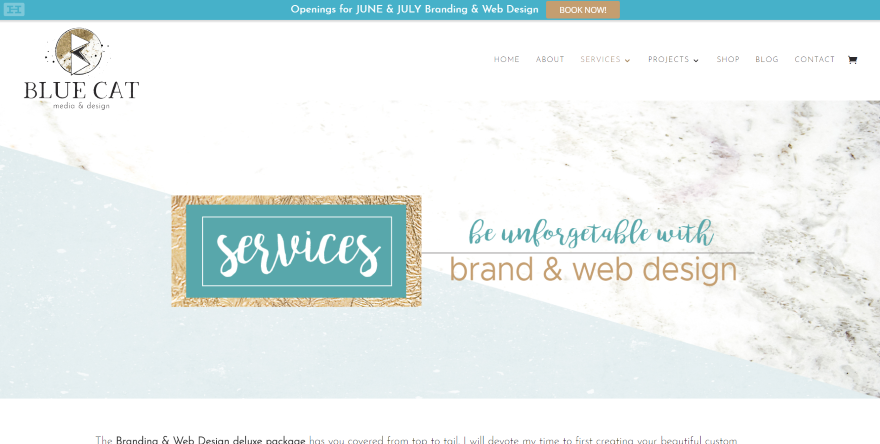 Ten wykorzystuje czysty projekt z dużą ilością białej przestrzeni. Strona jest poprzedzona dużym tytułem i krótkim opisem. Usługi są wyświetlane w dużych notatkach za pomocą cieni, ręcznie rysowanych grafik, tytułów, tekstu i stylizowanych przycisków do poszczególnych stron usług. Poniżej znajduje się CTA o pełnej szerokości, które odwraca niebieski lub biały kolor, aby wyróżnić się, zachowując jednocześnie elegancki wygląd. Szczególnie podoba mi się grafika i kolory.