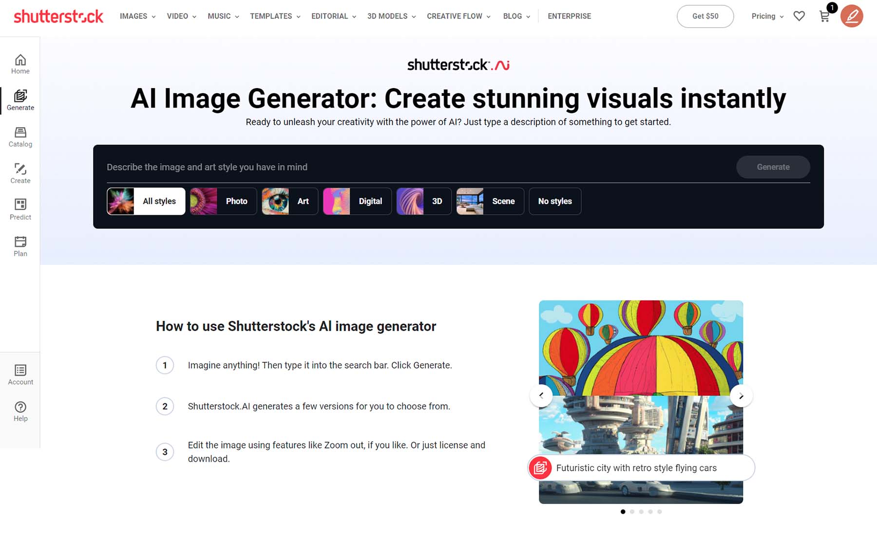 Popularna witryna nieodpłatna, narzędzie sztucznej inteligencji Shutterstock to prosty sposób na generowanie obrazów do użytku komercyjnego i osobistego. Jest wyposażony w określoną liczbę stylów obrazu. Ale kiedy je klikniesz, otwierają więcej opcji, których możesz użyć do udoskonalenia tego, co chcesz stworzyć. Chociaż narzędzie sztucznej inteligencji Shutterstock jest wspierane przez ogromną bibliotekę, generowanie obrazów zajmuje znacznie więcej czasu niż w przypadku innych narzędzi z naszej listy. Może to być wadą, jeśli musisz szybko grupować obrazy do swojego projektu.