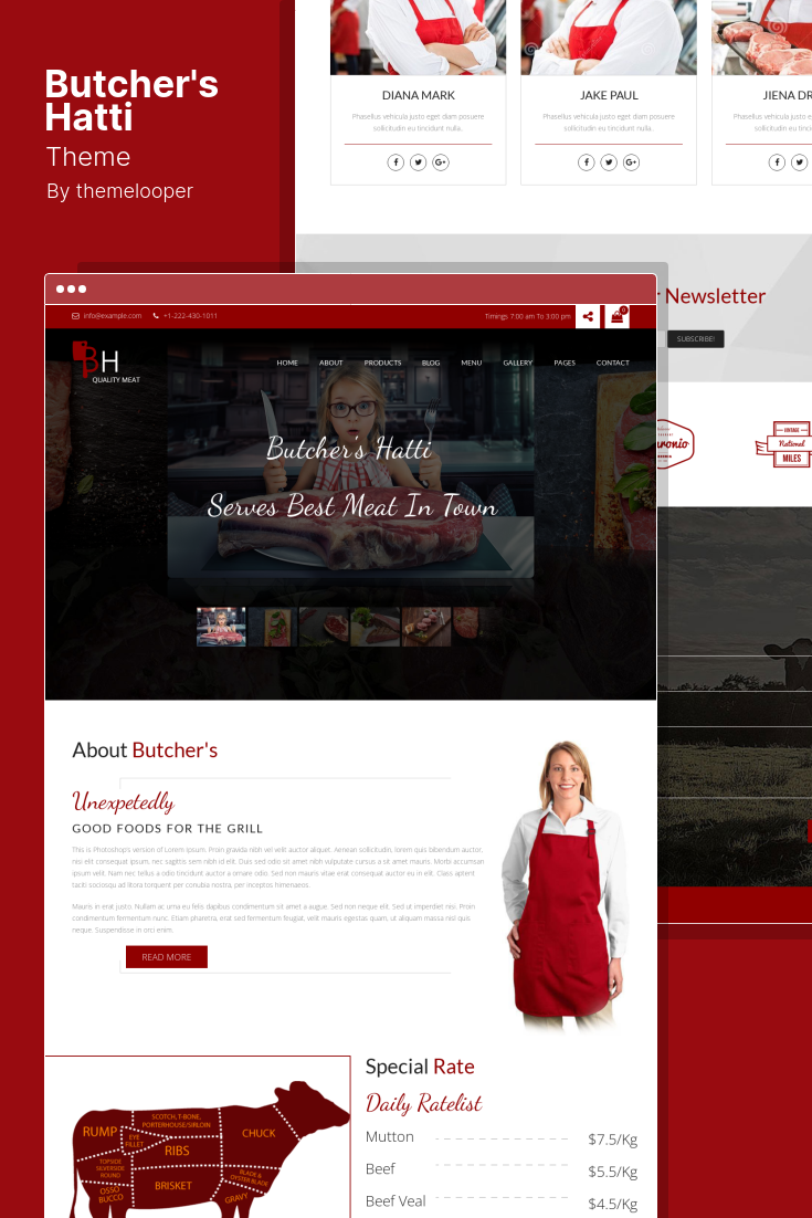 Oprócz motywów WordPress zbudowaliśmy również szablony witryn Butcher & Meat Shop. Jednak szablony te mogą być również używane w witrynach targów mięsnych, gospodarstw mięsnych, sklepów mięsnych, blogów kulinarnych, żywności, restauracji mięsnych, WooCommerce i firm.