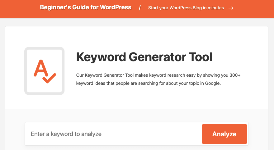 WPBeginner oferuje narzędzie do generowania słów kluczowych, z którego można korzystać całkowicie bezpłatnie. Pomaga w burzy mózgów na temat pomysłów na treść bloga i pomysłów na słowa kluczowe SEO. Największą zaletą tego narzędzia do badania słów kluczowych jest to, że nie musisz się rejestrować ani ujawniać swojego adresu e-mail.