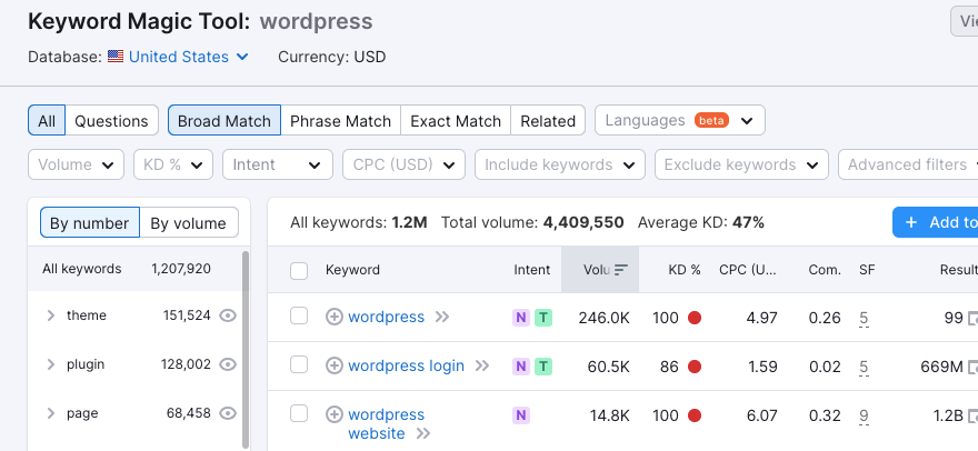 Następnie możesz użyć narzędzia Magia słów kluczowych, aby zbadać określone słowa kluczowe i określić liczbę wyszukiwań. Jeśli brakuje Ci pomysłów lub nie masz pewności, czym interesują się Twoi odbiorcy, możesz skorzystać z narzędzia Luki w słowach kluczowych. Pomaga to znaleźć nowe możliwości tworzenia treści, którymi zainteresują się Twoi odbiorcy.