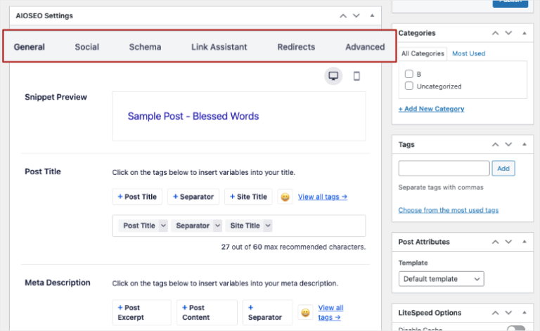 Następnie, zanim opublikujesz jakąkolwiek stronę lub post, zobaczysz sekcję AIOSEO w edytorze WordPress. Jest to analizator SEO na stronie, w którym możesz ustawić tytuł posta, metaopis, słowo kluczowe i schematy.