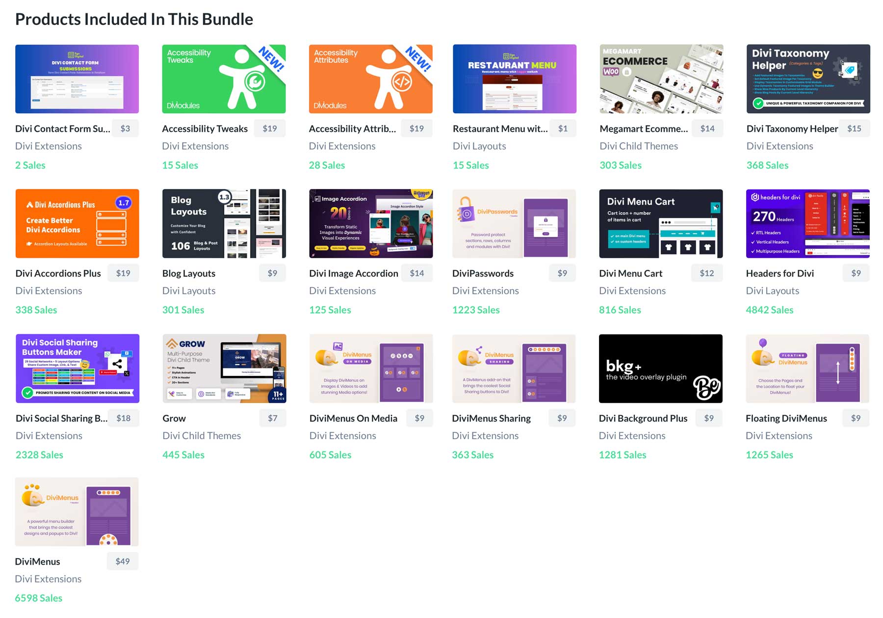 Pakiet Divi Value zawiera wszystko, czego potrzebujesz, aby dodać nowe układy, motywy podrzędne i rozszerzenia do swojej witryny Divi. W sumie jest 19 produktów, co czyni ten pakiet jedną z najlepszych ofert podczas naszej wyprzedaży.